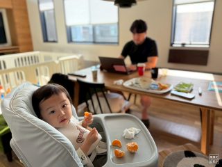 逆に条件反射できっちりカメラ目線を送ってしまう真熊だけが残される中、小倅はハイハイで部屋の隅へと突き進んでいき ───