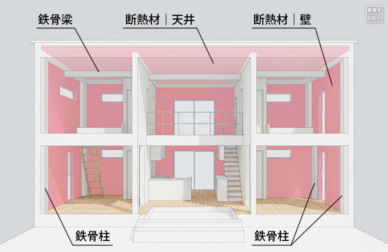 図のピンク色の部分が断熱材。