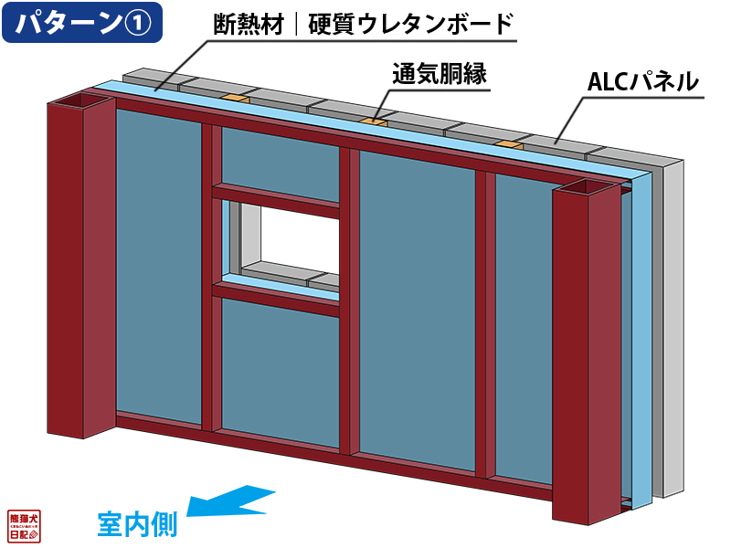前話のおさらいになるが、内断熱の場合は鉄骨胴縁の外側に外壁材であるALCパネルを直接取り付け、室内側に断熱材を吹き付けるのだが、外断熱工法の場合はこの構成がまったく異なる。