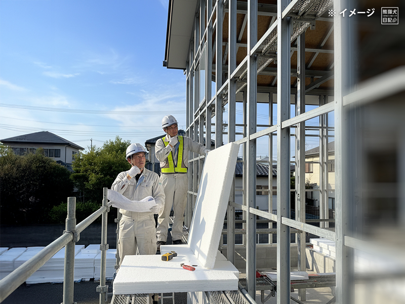 - 鉄骨胴縁の外側に硬質ウレタンボードの断熱材を貼り、家全体を包む。