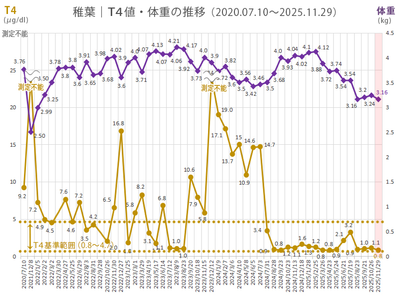 まずは、甲状腺ホルモンを示す「T4」という数値。 ※グラフの茶色の折れ線