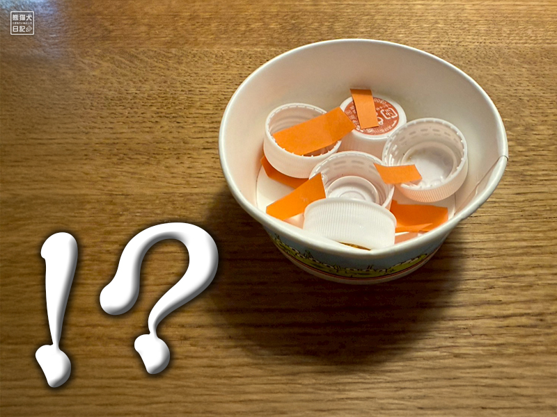 ちなみにカップの中身は、ペットボトルの蓋と短冊状にカットしたオレンジ色の色紙で、ウェットフードにツナをトッピングしたメニューをイメージしているとのこと。