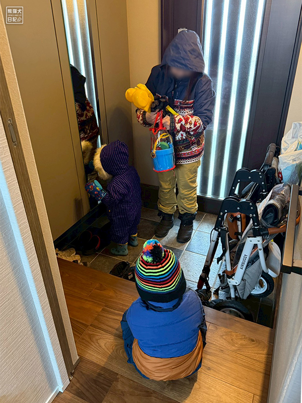 雪支度をして人生初の雪遊びに挑む子供たちに二発目を。
