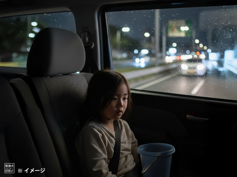 車の後部座席にバケツを持たせて乗せて「吐くときはこのバケツに」なんて指示を4歳児が遂行できるはずもなく、かと言ってまだ完治していない嫁女房が、同じく本調子ではない小童を伴って同乗することも無理がある。